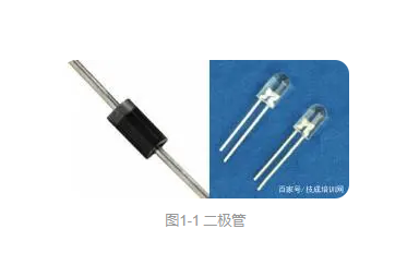 二极管具有单向导电性,所以其管脚要区分正负极(阴阳极),例如图1-1所示,左边为整流二极管,灰色环一端为阴极(负极),右边为LED二极管,短脚对应阴极。