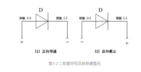 所谓单向导电性,是指二极管电流只能从阳极经管流到阴极,如下图1-2所示,此时阳极电位要比阴极电位高,这就是二极管的正向导通。若二极管的阴极电位比阳极高,二极管将不会有电流流过,相当于开路,这就是二极管的反向截止。
