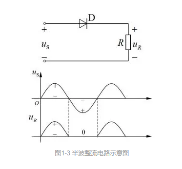 基于二极管的单向导电性,其整流电路如图1-3所示,只需一个二极管就可以实现将交流电变成直流电。输入电压为正弦交流电,其波形分为正负两半。
