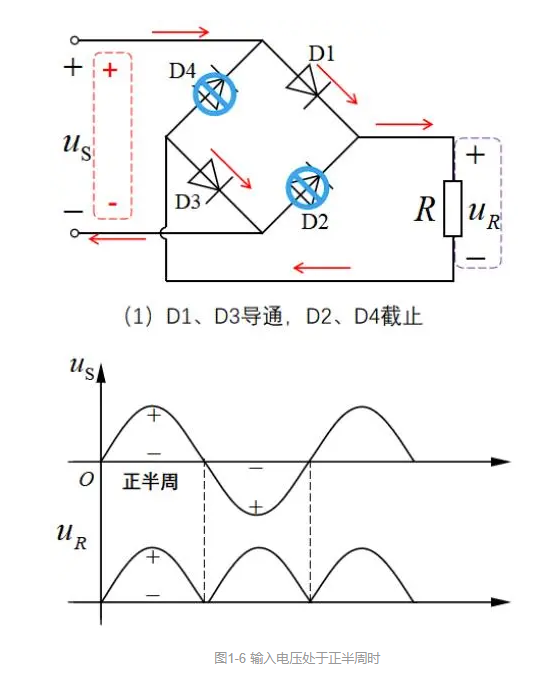 如图1-6,当输入电压波形处于正半周时,表明其实际方向恰好是输入电压上“+”下“-”,此时二极管D1阳极处于高电位,所以正向导通,但二极管D4阴极接高电位,所以反向截止。同理,二极管D3阴极接在低电位上,所以正向导通,但二极管D4阳极接在低电位上,所以反向截止。