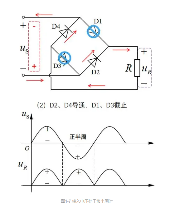 2、当输入电压为负半周时,二极管D2、D4正向导通,二极管D1、D3反向截止,如图1-7所示。